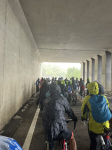下山待機中に大雨が降り出して急遽最後のトンネル内に集団で移動。